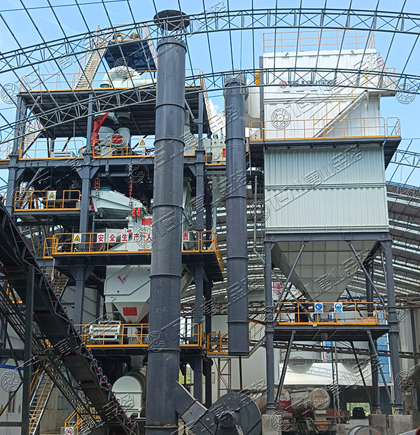 原料經(jīng)過電子秤進入到皮帶輸送機中,由全封閉的提升機將物料入到五孔碾磨制砂機內(nèi)進行破碎處理,再由空氣篩對破碎后的物料進行篩分、選粉處理,篩分后的較大物料會返回五孔碾磨制砂機中進行二次破碎,符合要求的砂子則經(jīng)加濕拌合機處理后由傳送帶輸送至成品倉中;篩分過程中的粉塵會經(jīng)粗細(xì)粉分離機進入到布袋收塵器內(nèi),而其中較大的粗顆粒會在粗細(xì)粉分離機的作用下,按需求在成品砂中進行回?fù)?,?xì)粉塵將通過風(fēng)力進入到布袋收塵器,作為副產(chǎn)品進行使用。